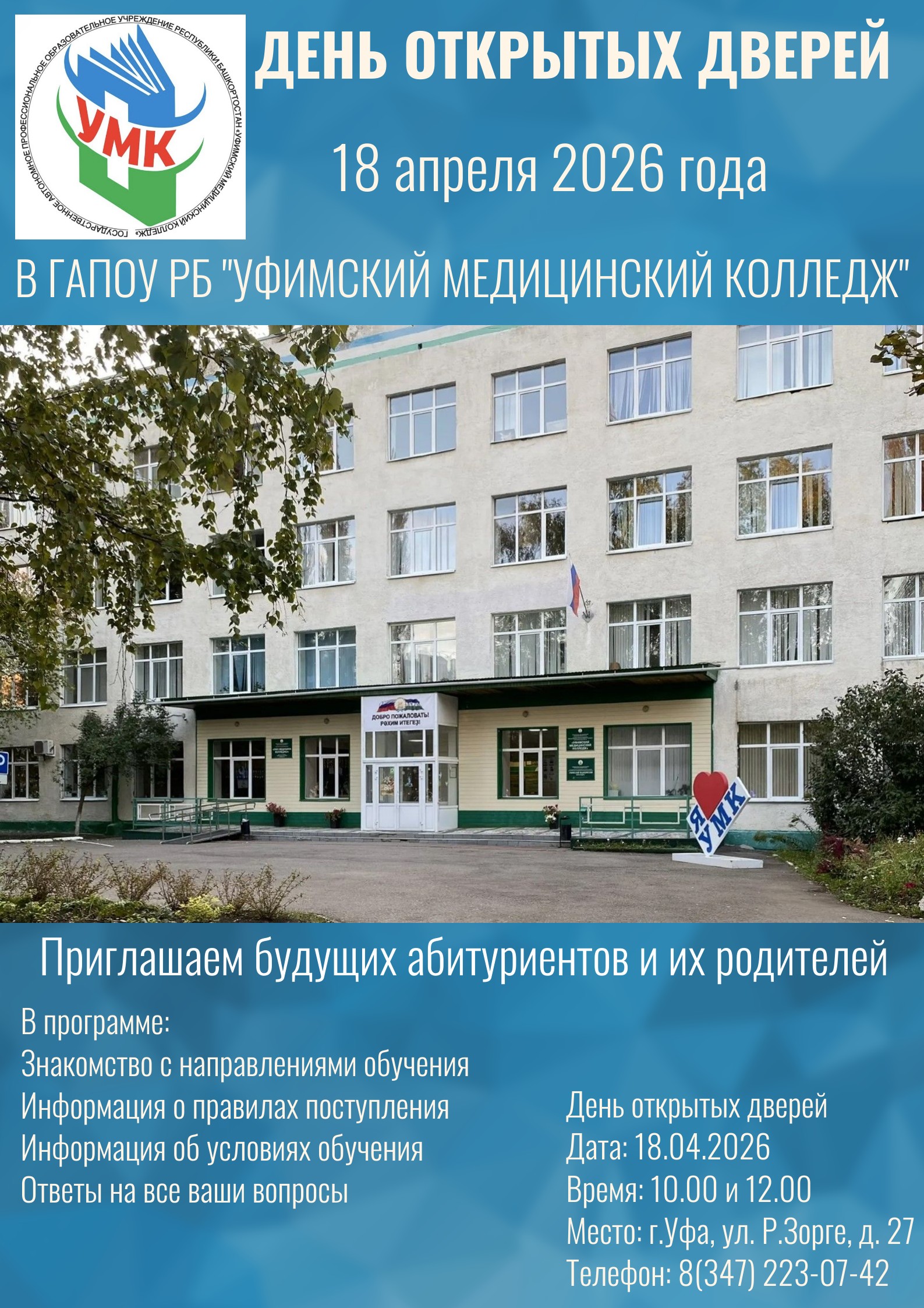 Уфимский медицинский колледж приглашает на День открытых дверей, который состоится 28 марта 2023 г. в 12.00. Будущие абитуриенты смогут узнать об истории колледжа, о специальностях по которым ведется подготовка и получить ответы на все интересующие их вопросы.