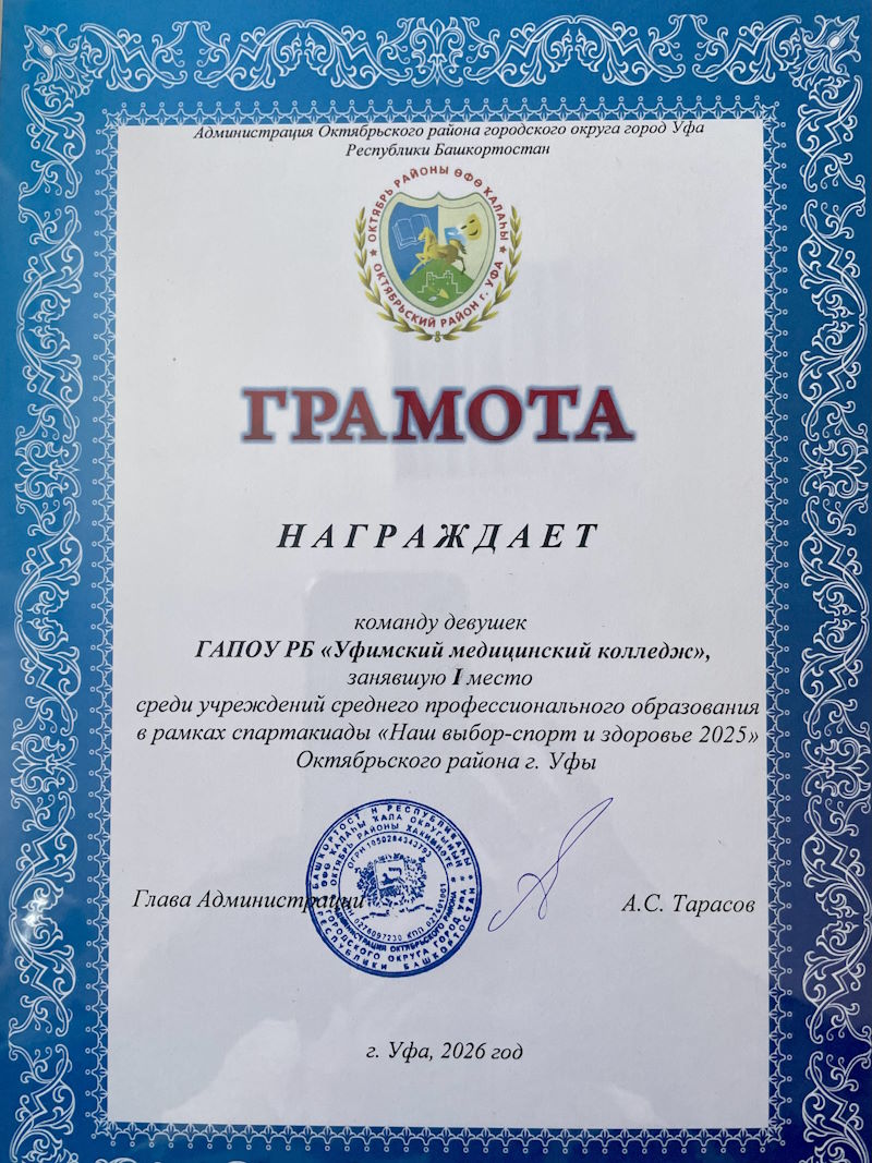 29 января 2026 года на базе Пространства инициатив и творчества «Притяжение» состоялось совещание по итогам спортивно- массовой работы в Октябрьском районе г. Уфы за 2025 год. Сборная команда ГАПОУ РБ «Уфимский медицинский колледж» по результатам участия в шести видах спорта уверенно заняла -1 место в Спартакиаде СПО Октябрьского района г. Уфы «Наш выбор - спорт и здоровье 2025». За достигнутые результаты руководителю физвоспитания Колечкиной Е.В был вручен памятный кубок и почетная грамота. Поздравляем с заслуженной победой, всех кто принимал участие в соревнованиях и преподавателей физической культуры за успешную подготовку студентов!